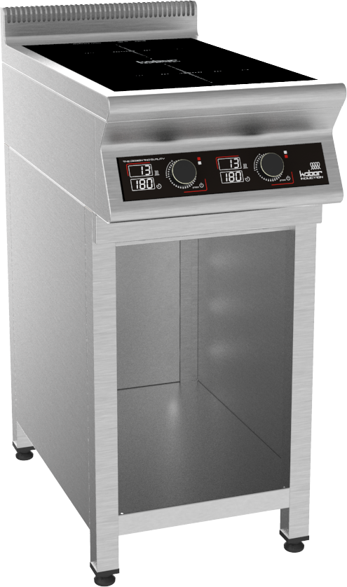 Плита индукционная на полузакрытой подставке, 2 конфорки мощностью 2х3,5кВт, электронная панель управления с цифровой индикацией, 13 уровней нагрева, таймер до 180мин., съемный жировой фильтр, корпус из н.с. AISI 304, регулируемые по высоте ножки, рабочая поверхность - стеклокерамика 6мм, 7 кВт, 220В, вес 36 кг.